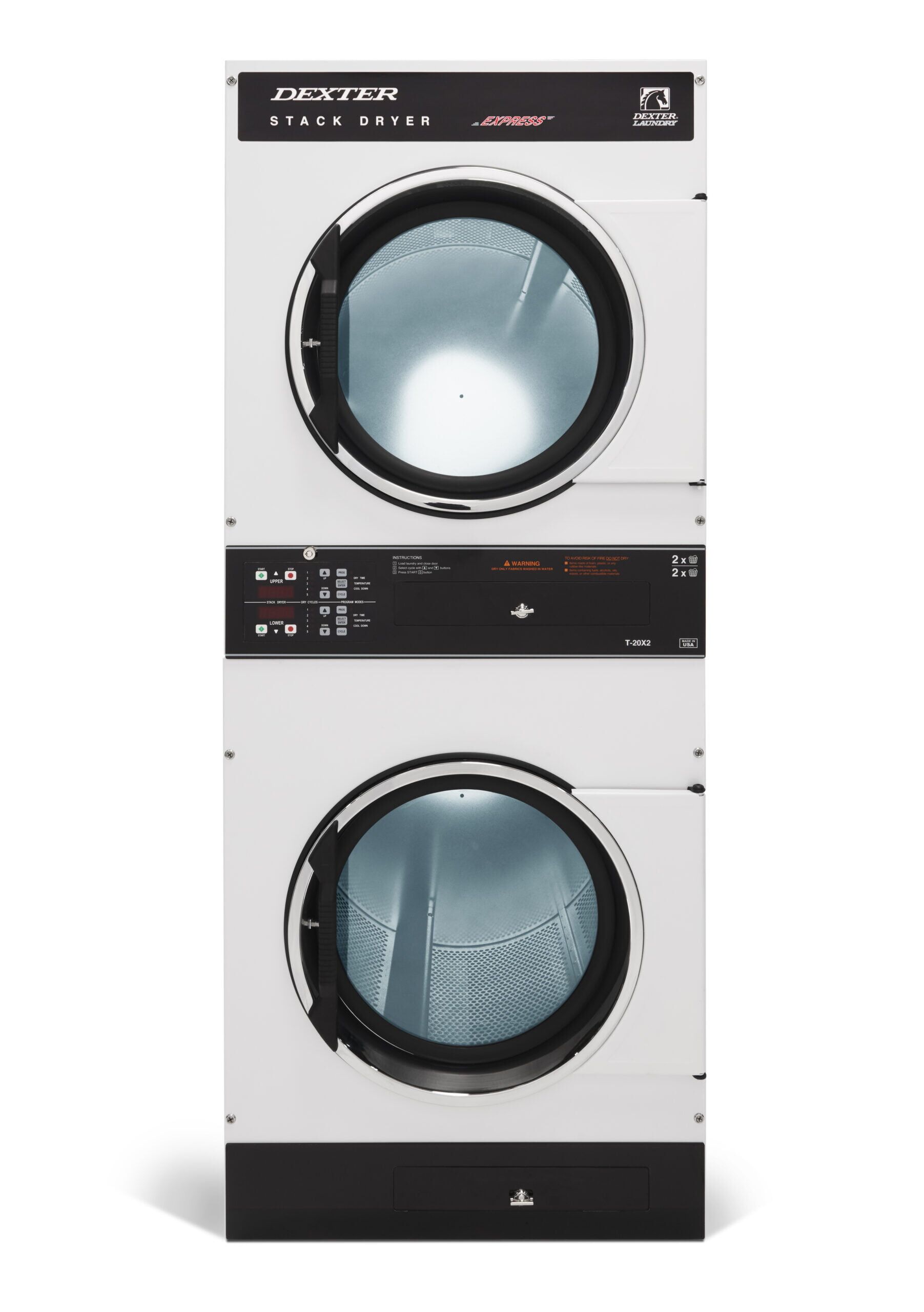 Dexter T-20×2 20lb On-Premise Stack Dryers, Total 40lb Capacity, 6 Program Microprocessor, Black Graphics, Natural Gas, White Panel, Stainless Steel Door, 56,000 BTU, 370 CFM, Air Recirculation, Fully Perforated Galvanized Cylinders, Heavy Duty Welded Frame, Single Gas and Electrical Connections, Extra Large Replaceable Lint Screens, Single 8” Exhaust Duct, 120, 208/240/60/1