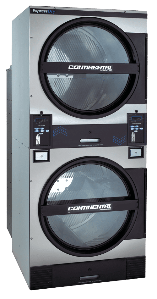 The Continental ExpressDry line of commercial dryers delivers quicker drying using fewer BTUs per load. ExpressDry packages the best in programmability, durability, efficiency and ease of use! Request a quote from your local distributor for our coin-operated laundry equipment. Available in 30-, 55- and 75-pound capacity single pocket dryers and 30- and 45-pound capacity dual-pocket stack dryers.