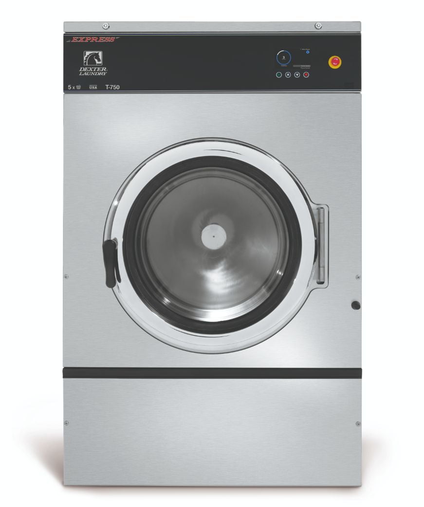 Dexter T-750 50lb Capacity O-Series On-Premise Express Washer, Total Control LCD Display and O-Series Controls, Black Graphics, 6.5 cu. ft., 200 G-force Extract, Pressure Sensor, Variable Speed Drive, 100 Fully Customizable Cycles, Management Tools, Programmable Chemical Injection System, 304 Stainless Steel Cylinder, Outer Tub, Top, Front and Side Panels, Heavy Duty Bearing and Seals, 208-240/60/1 or 3